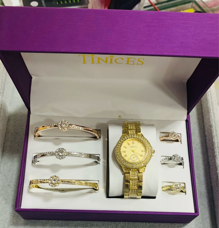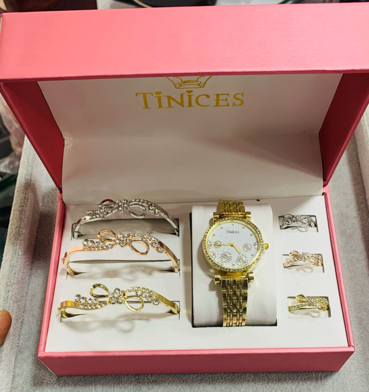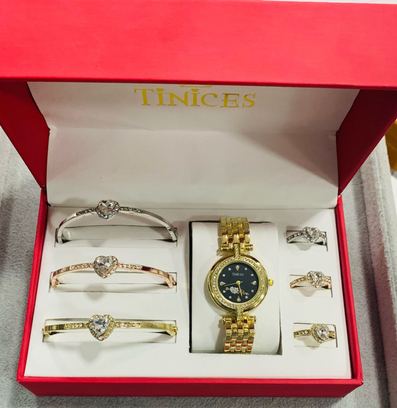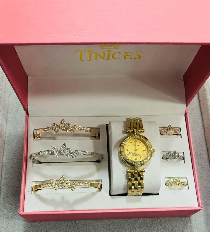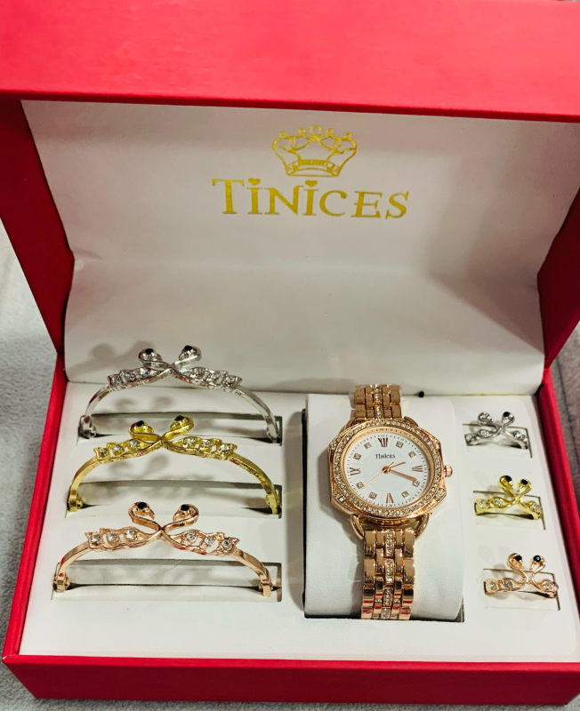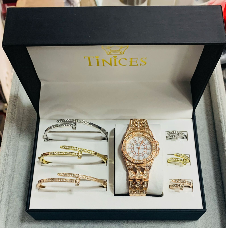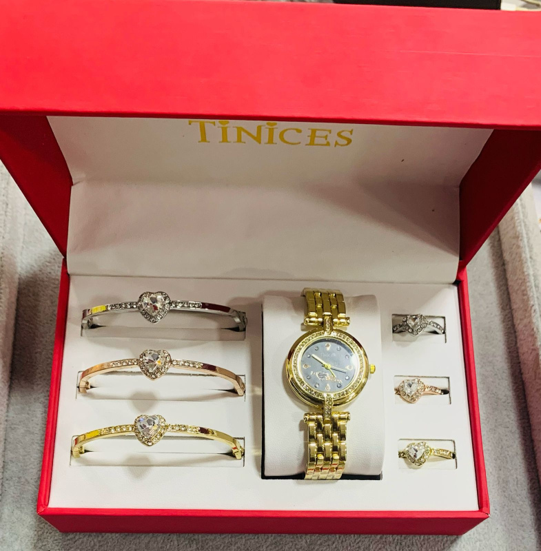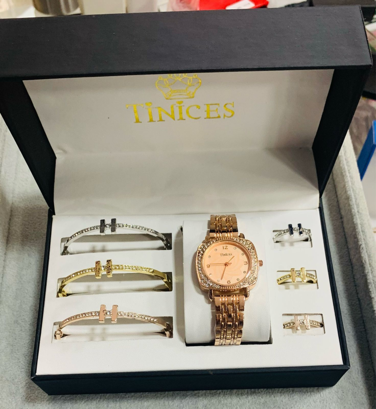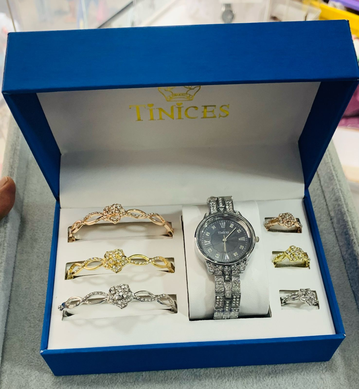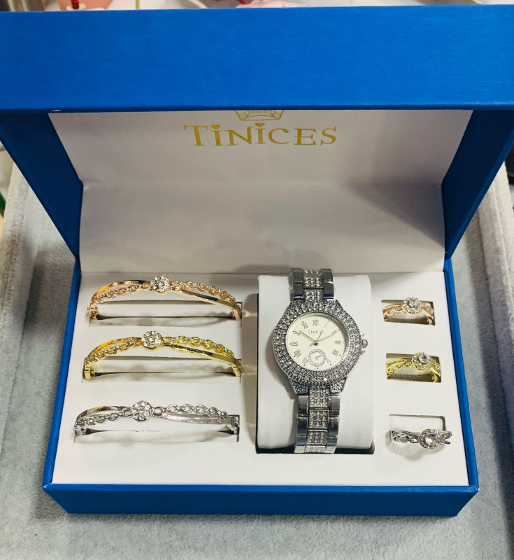 This stunning TINICES gift set includes a beautifully designed wristwatch, bracelet and ring, all adorned with sparkling blue crystals for a classy and timeless look.