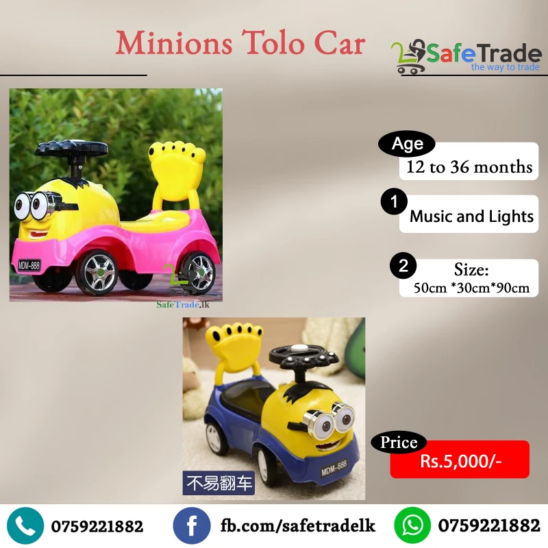 Buy safe and affordable push Minions tolo cars with music and lights . Perfect first ride-on toy for toddlers. Shop quality baby tolo cars online at Safetrade.lk.
